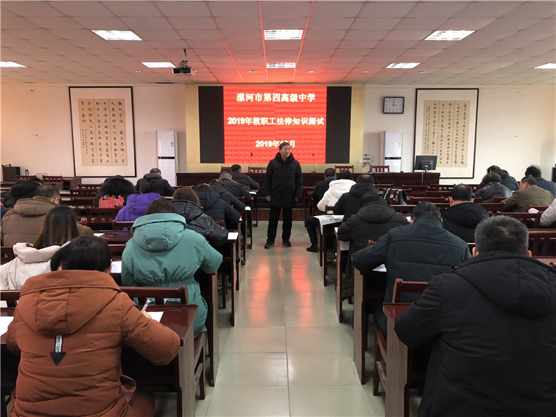 为教育引导教职工增强法治观念,养成自觉守法、遇事找法、解决问题靠法的思维习惯和行为方式,推进国家级依法治校示范校建设,构建和谐校园,1月8日下午,漯河四高组织教职工开展法律知识集中测试。学校全体行管人员70余人参加此次测试。