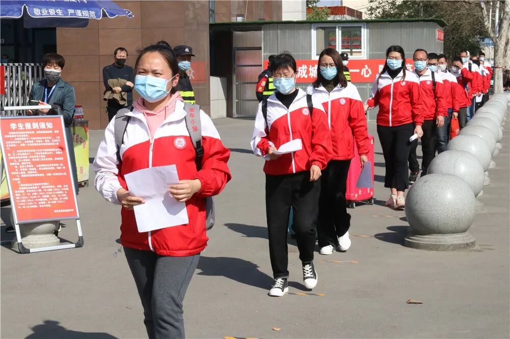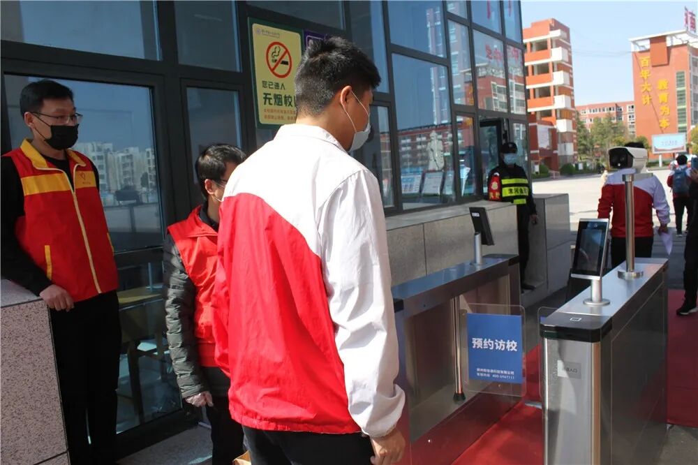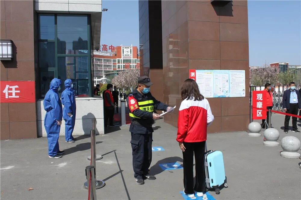 学生手持学生证、健康表,按照安全距离排队,有序等待测温入校。