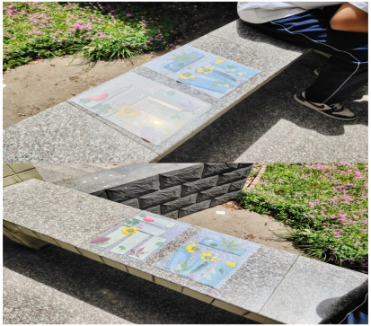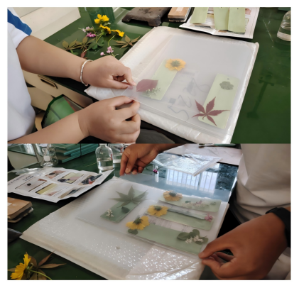 第二步,构思图像。学生选取自己提前准备好的植物标本(落叶或花草),把它们紧贴在书签表面。大家按照自己的想法摆放,构思自己的书签。