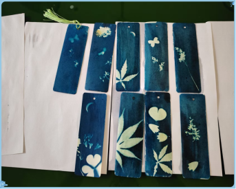 最后一步,晾晒,将冲洗好的书签放在通风处晾干,蓝晒作品完成。每一张书签都因介质、光照条件、手工操作的差异而独一无二。