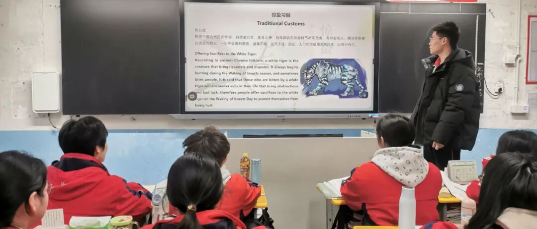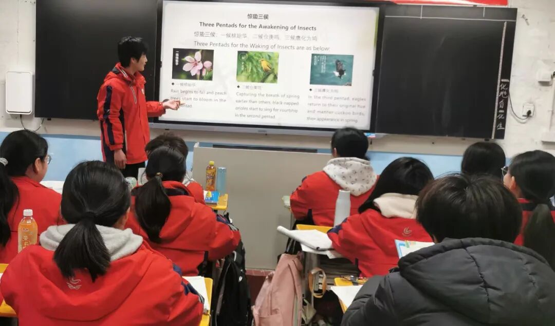活动伊始,一段惊蛰主题英语短片,悄然推开了惊蛰文化的大门。短片里,春雷阵阵,震动山川大地;昆虫蠕动,开启新一岁的生命序章;田间的农民辛勤耕耘,绘就一幅满是希望的春耕图景。地道的英文解说阐述着惊蛰的天文含义与厚重的文化底蕴。同学们沉浸其中,在“Spring Thunder”(春雷)的轰鸣与“Insect Awakening”(昆虫苏醒)的奇妙景象里,自然而然地掌握了惊蛰相关的词汇与表达,感悟着大自然的神奇变化。