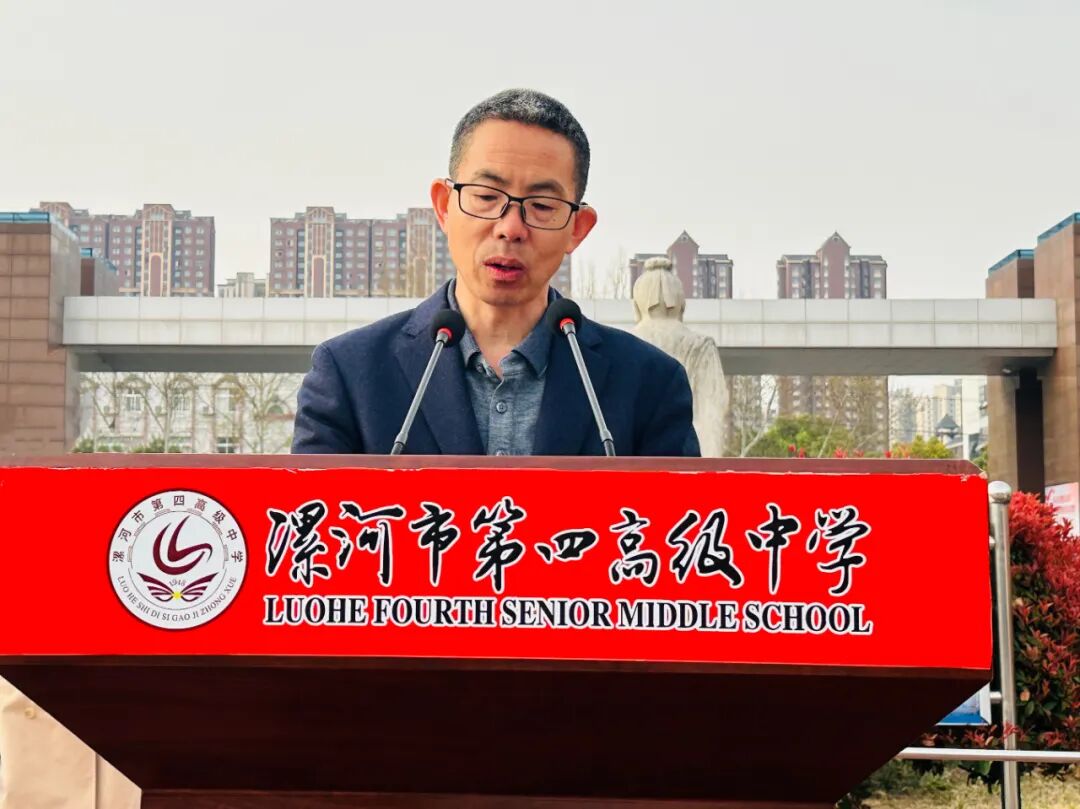 漯河四高校长朱军华在国旗下发表讲话。他向同学们提出了建议与期待。他送给同学们四句话:一是学习是你自己的大事。只有勤奋学习、刻苦努力,才能选择好大学、选择好职业,人生才会有自由,才会更幸福!二是自律方可自由。朱校长向同学们介绍了双休日“黄金分割法则”和“三三制”秘诀,启发同学们要合理规划、利用周末提高自己。三是时刻做学习的主人。比记忆更重要的是重构知识的素养,比分数更重要的是驾驭思维的能力。四是自学力决定人生的上限。人的一生中,90%的知识获取靠自学。自学是拉开差距的终极武器,是决胜未来的第一法宝。