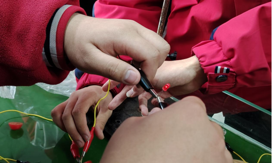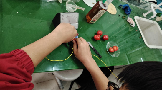活动伊始,社团指导老师边演示边向同学们讲解水果发电的原理:“番茄中的酸性汁液可作为电解质溶液,锌片与铜片插入后形成闭合回路,电子通过导线转移产生电流……”。理论讲解后,同学们跃跃欲试,拿出提前准备好的番茄,领取锌片、铜片、导线、电流计和LED灯等材料,开启“电力工程师”初体验。