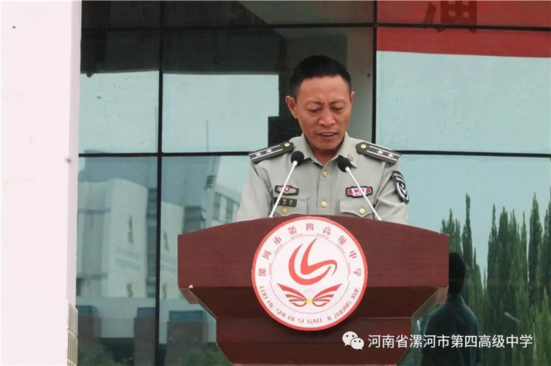 会议特邀漯河市全民国防教育中心主任唐明杰主任,学校校长赵耀堂、党委书记苏玉红、学校副校长刘海喜、副校长孟翔宇、高一年级负责人、政教处负责人出席大会,大会由高一年级主任胡书辉主持。