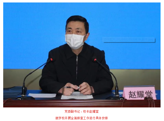 会上,赵耀堂传达了《河南省新冠肺炎疫情防控指挥部教育系统工作专班办公室关于对学校疫情防控情况进行全面排查的紧急通知》文件精神,并结合学校实际,就对照要求开展全面排查工作进行具体安排。